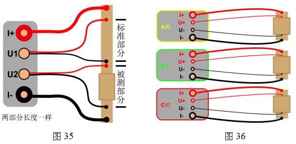 選型二相測(cè)試時(shí),一般為導(dǎo)體電阻專用測(cè)試儀,用來(lái)檢測(cè)電線電纜等接頭,要求等距含接頭部分的電阻要小于等距不含接頭部分的電阻,儀器自動(dòng)產(chǎn)生兩者之間的電阻的比較值。電流一般是共用的,電壓改為兩個(gè)二芯航插。有專用電阻測(cè)試夾具(選配)更方便保證兩個(gè)部分的距離,也方便標(biāo)定距離的長(zhǎng)度和截面積。如圖35: